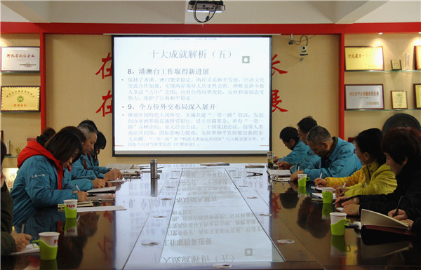11月23日,际华3514公司邀请中共石家庄市委党校王艳品副教授进企业深入解读和宣讲党的十九大精神。公司党群人员、各党支部书记及支部委员与会学习。井陉公司、抚宁公司视频参会。