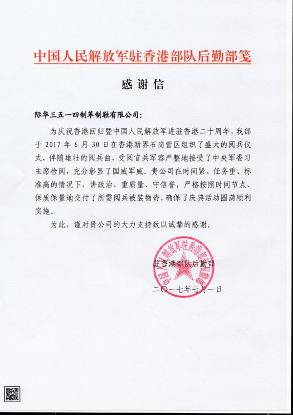 驻香港部队后勤部向际华3514公司发来感谢状及感谢信