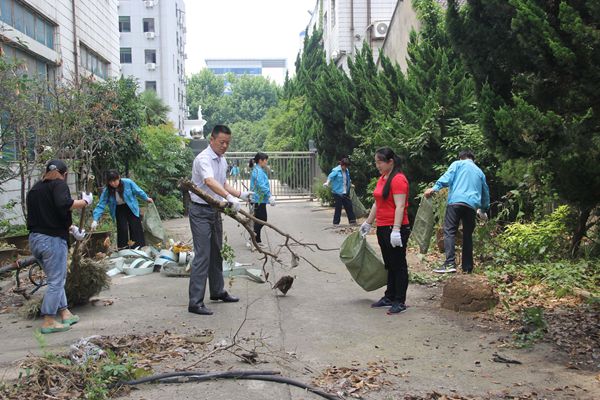 5302公司芳草优美,绿阴如盖,员工们在赏心悦目的环境中工作也是一件趣事。但仍然会有一些随手丢弃的白色垃圾、碎纸屑等废弃物以及清洁死角,不仅影响了心情,还丑化了形象。6月9日南京突如其来的一场特大暴雨将污秽物冲积,工作量着实不小。责任部门将厂区划分为七个区域,以各党支部为单位,分别对责任区进行清理。劳动现场,党委书记王建平等公司领导身先士卒、率先垂范,不怕脏累钻到绿化带、树丛中清理垃圾,挥舞着铁锹将卫生死角垃圾清除,在他们的带动和感染下,大家通力协作,有人将枯枝拖出树丛,有人把砖块移位,有人捞出水池中的杂物……即使天气闷热潮湿,人人汗如雨下,也没有叫苦叫累。经过一个多小时劳动,厂区焕然一新,看着清爽的环境,大家脸上都露出了欣慰的笑容。