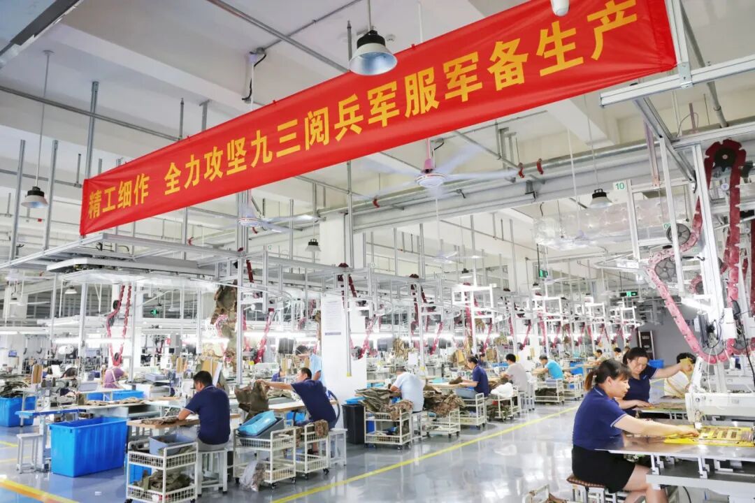 “全厂动员、全员关注、全体参与”已成为阅兵保障生产现场的生动写照,职能部门、车间管辅、修机组辅助人员齐上一线,与基层员工并肩作战;全体员工以“时不我待”的紧迫感抢时间、赶进度,战高温、斗酷暑,在流水线上默默坚守。有的人员主动递交请战书,支援生产一线;有的班组自愿立下军令状,坚决完成生产任务;有的职工带病坚持工作,主动增产……广大干部职工以完成阅兵保障任务为荣,从裁剪的精准无误,到缝纫的细致入微,再到包装发运的严谨有序,50多个日夜的连续奋战终见成效,所有产品按期高质量交付,获得了部队领导和官兵的赞扬。